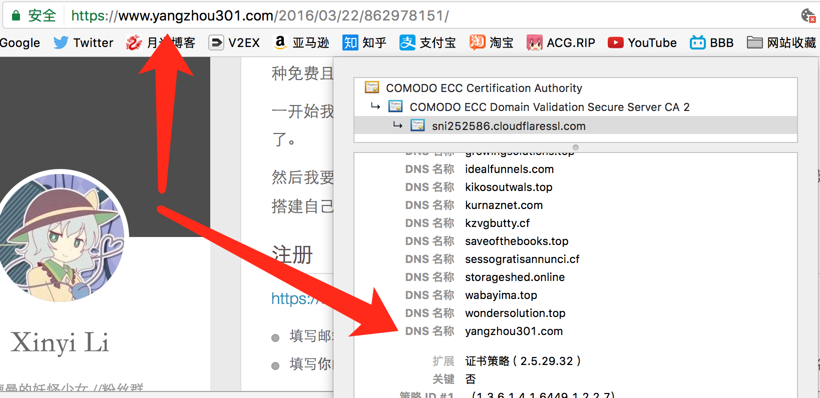 通过上图可以得知,Cloudflare通过申请一个具有二十个左右不同的DNS名称的证书,使多个网站共用一个证书。这也说明了为什么配置时间要一个小时左右,因为要凑齐二十位“乘客”才可以“发车”呀~笑cry。